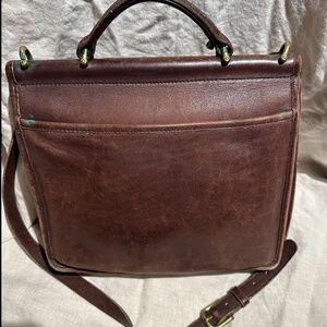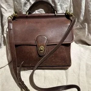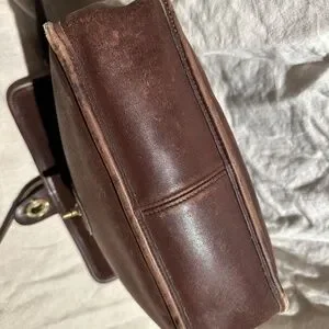 Vintage Coach Crossbody Bag. Made in the United States. Strap, handle, and stitching are all in good condition. No odors or stains. All hardware is in good working condition but there is some tarnish (see photos) that I have not tried to polish or clean. Leather is supple but has scuffs and scratches, giving the bag a definite vintage-boho patina. Significant scuffing on bottom of bag (see photos). Approximate dimensions are 10"long x 10" tall x 3.5" wide.