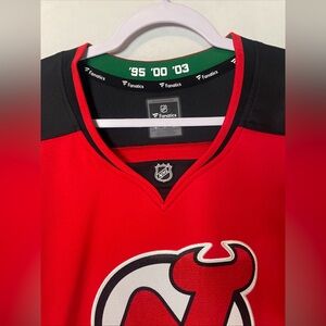Women's. New Jersey Devils hockey jersey featuring player Jack Hughes. It is officially licensed by the National Hockey League (NHL) and made by the brand Fanatics. Features Stanley Cup Years ‘95, ‘00, and ‘03. A must-have for any female supporter of the New Jersey Devils looking to represent their favorite team and player on the ice.