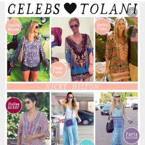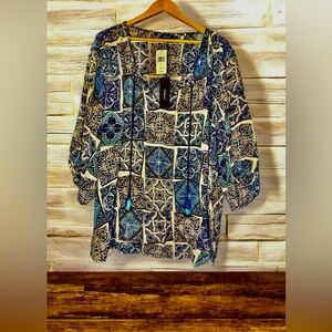 BRAND NEW WITH TAGS Tolani (sold exclusively at Anthropologie) Edith Tiles Print top in size 2X and 100% silk. Tolani blue multi printed silk tunic top with tasseled tie detail, 3/4 sleeve, size 2XL blue printed 100% silk boho blouse