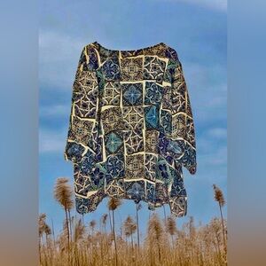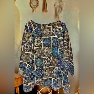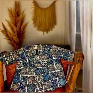 Up for sale is a"blue and white graphic tunic blouse" from the brand Tolani, featuring a mosaic tile pattern. It offers a relaxed fit and is often described as having a bohemian or casual style.