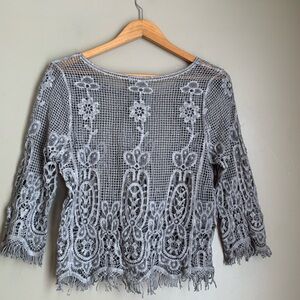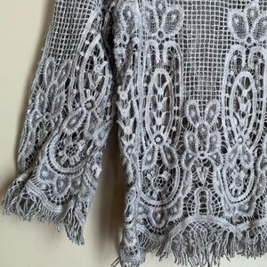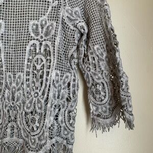 Liquid by Sioni Womens Gray Crochet KnitTop Size M/L Boho Overlay 3/4 sleeve