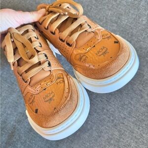 Stylish MCM sneakers with a brown upper. Features white soles. Perfect for casual wear.