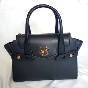 Crafted from durable, scratch-resistant Saffiano leather in black, this bag is built to last and maintain its shape. It features rolled top handles, gold-tone hardware, and belted side details. The structured silhouette offers a polished look. It comes with a detachable and adjustable crossbody strap and includes the original MK tag.