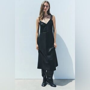 ZARA WOMAN COLLECTION Midi dress with a V-neck and thin straps. Tonal fabric details. Flared hem.