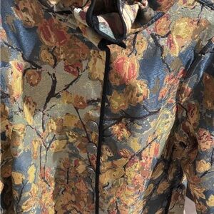 Stylish jacket with a vibrant floral pattern. Features shades of yellow, orange, and blue.