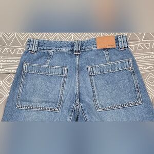 Great condition. Size 26. Barrel leg style. Legs have darted areaby the knees to articulate the curved looked. Patch front pockets. Button fly. Medium wash with whiskering details. Measurements and fabric content listed above in pictures.