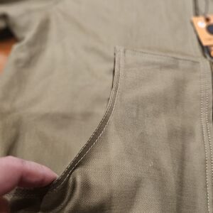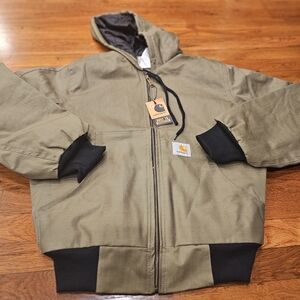 Stylish olive hooded jacket with black accents. Features a front zipper and cozy hood.