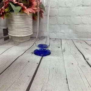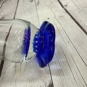 Beautiful blue glass vase with a unique shape. Perfect for home decor.