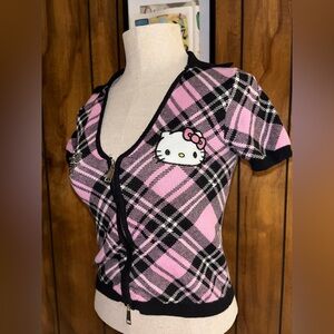 Cute pink plaid cardigan with Hello Kitty design. Features a zip-up front and short sleeves.