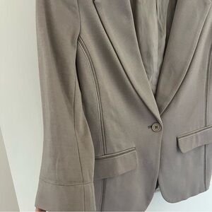 Anthropologie Yoana Baraschi Knit Silk-Lined Blazer Taupe, size small. Can be dressed up or down! Rayon shell with piping, notched lapel, three-quarter-length sleeves, and two front flap pockets. 100% silk lining.