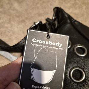 Chic black shoulder bag with bold eyelet accents. Ideal for versatile styling.