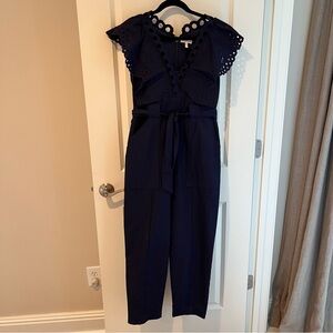 Rebecca Taylor Ariana Eyelet Embroidered Jumpsuit, size 8, navy indigo blue. Worn once! A utilitarian style jumpsuit is softened with our custom Ariana Eyelet, an oversized embroidered eyelet with a floral motif and large-scale scalloped edges that’s overlaid on the bodice. Oversized front and back pockets and a tie waist enhance the structured silhouette.