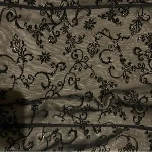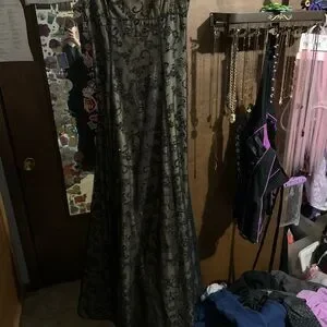 Chic black maxi dress with silver detailing. Perfect for formal events. Elegant and stylish design.