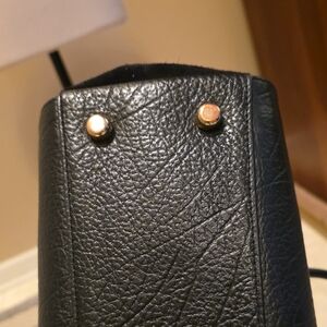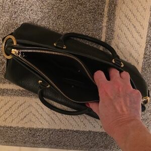 Chic black leather satchel by Coach. Features gold-tone hardware. Perfect for every day.