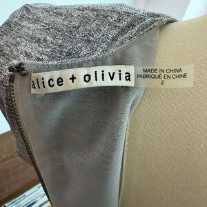 Chic Alice + Olivia dress with a shimmering silver finish, gathering detail, and mid-length sleeves.