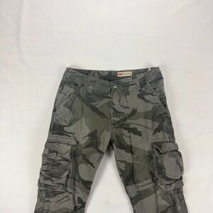 Design: Multi-pocket cargo style, zip fly, button closure, camo print