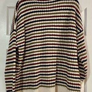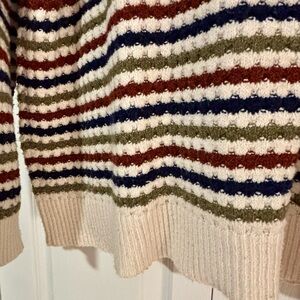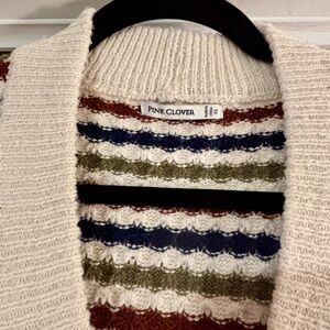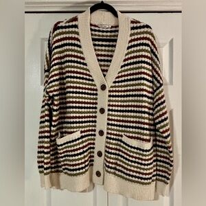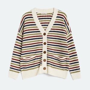 Chic cardigan with multicolor stripes. Features button-up front and cozy fit. Ideal for layering.