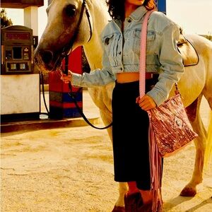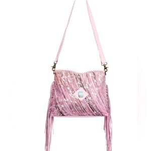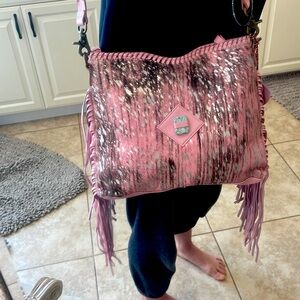 You'll love your look with this magnificent bag! Gorgeous pink hair-on hide is accented with silver foil color. The front has a beautiful pink leather and stone inset. The top features special stitching in pink leather. The back includes an extra zippered pocket. The final flourish is matching leather fringe draping from both sides. An exciting combination of colors and textures!