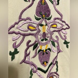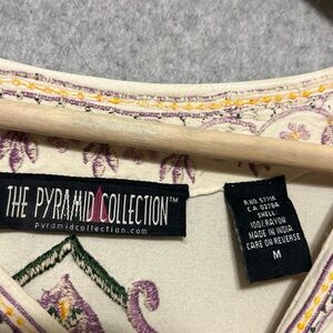 This item is a Bohemian-style, long-sleeve, floral embroidered tunic from The Pyramid Collection. It is made of rayon and features a V-shaped neckline, bell sleeves, and intricate multi-colored (predominantly purple and green) embroidery along the neckline, cuffs, and hem.