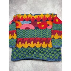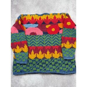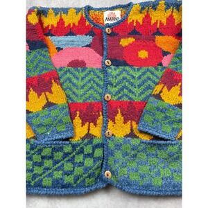 VTG AMANO Hand Knit 100% Wool Cardigan Sweater OS Made Bolivia Folk Art Floral