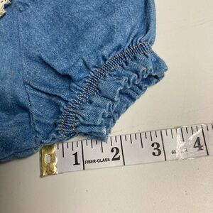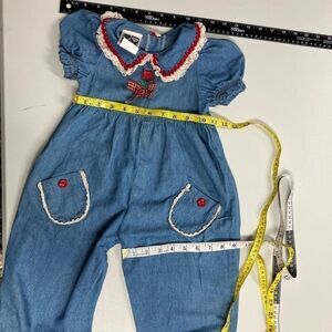 VINTAGE, WHO’S THAT BABY?, Child’s Denim Jumpsuit, Size 3T, Girl’s, One of a kind! Made in USA, 100% Cotton, two pockets with red buttons, embroidery around the neck collar. Flower and bow on chest, elastic at the ankles, and sleeves. Red embroidery has bled onto the white embroidery around the neckline,see pictures. Vintage clothing usually run smaller so, please check pictures for approximate measurements, before purchasing. Send me an offer. I will either accept or counter!