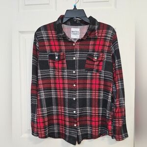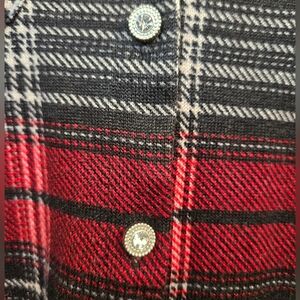 Cozy plaid shirt with button-down front. Features chest pockets and roll-up sleeves. Perfect for casual outings. Sparkly buttons.