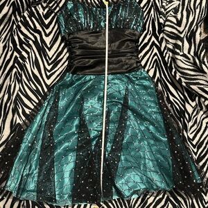Blue-Green Vintage Party Dress w/ Mesh Tulle Overlay