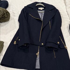 Chic navy trench coat by Michael Kors. Features gold zipper details and button accents. Perfect for a stylish look.