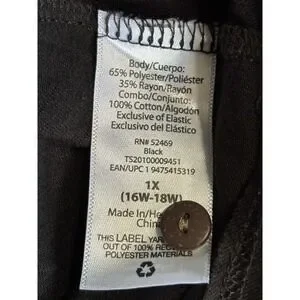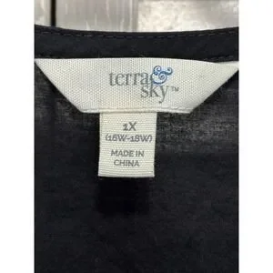 The Terra & Sky Black Blouse in size 3XL is a stylish and versatile button-up front top with short flutter sleeves and smocked detailing. It is 25.5" pit to pit and 31" length. Made from a blended fabric of polyester, rayon, and cotton, this blouse is lightweight, breathable, and suitable for all seasons. The V-neckline and collarless design add a modern touch, making it perfect for various occasions such as travel, parties, casual outings, and workwear. Easy to care for with machine washable instructions, this blouse in classic black color is a wardrobe essential for any woman looking for a slimming and comfortable fit.