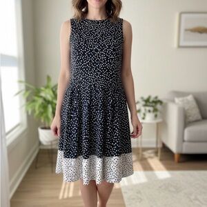 Classic Lauren Ralph Lauren sleeveless fit & flare dress featuring a black and white polka dot print with contrast hem. Timeless, flattering silhouette perfect for work, brunch, or events. Fully lined with back zipper closure.