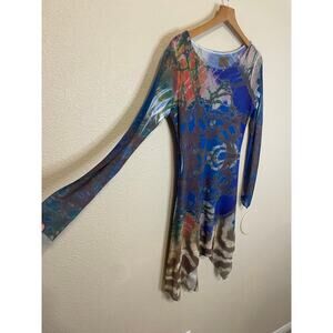 Tee's by Viviana G Y2K Boho Mesh Long Sleeve Handkerchief Hem Blue Printed Top Medium