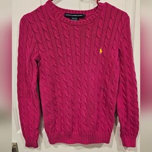 Bright pink (fuchsia) cable knit sweater by Ralph Lauren sport. Size M. Features classic crew neck design with yellow logo. **EXCELLENT CONDITION** Size Medium.