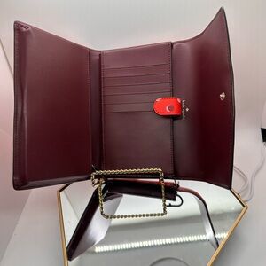 Chic red clutch with playful white polka dots. Features a stylish gold handle. Ideal for a fun night out. Can hold your phone on the snap side and other essentials on the zip side. Has Card slots and the double snap closure keep your phone secure. 7.5” x 4.5” x 2.5” NWOT!! No call outs!!