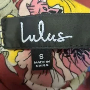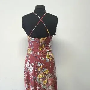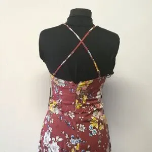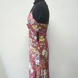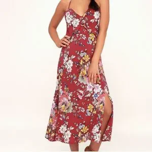 This dress by Lulu's features a vibrant multicolored floral print pattern against a burgundy background. 17" underarm to underarm, 48" shoulder to hem, 14" at waist. The knee-length dress is sleeveless with a flowy, lightweight material perfect for warm weather occasions. Lulus Dark Red Floral That Loving Feeling Midi Sundress.