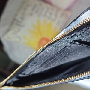 Elegant black wallet with gold zipper. Iconic logo on front.