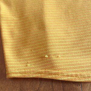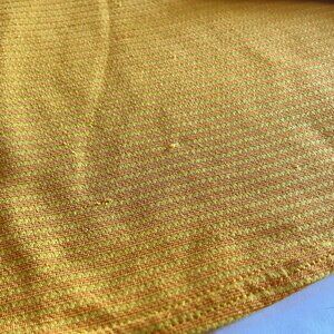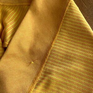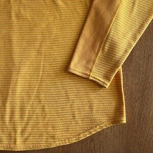 Patagonia vintage golden yellow and orange microstripe capilene long-sleeve baselayer shirt in men's size Small. Ringer collar with raglan sleeves, slightly fitted style for layering. Measurement across the chest laid flat pit-to-pit is 19 inches. GUC for vintage, with several snags near the waist and hem and on the sleeves (see close photos).
