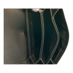 Sleek black leather card case by Coach. Features a classic design with white stitching.