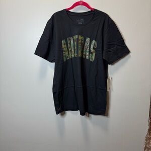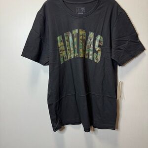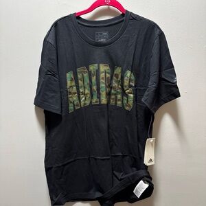 Stylish black tee with bold camouflage Adidas logo. Ideal for casual wear.