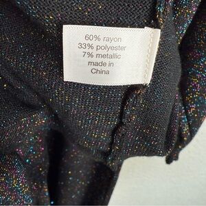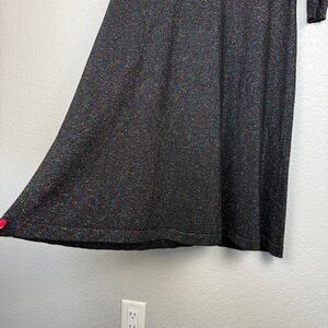 This Lane Bryant black midi sweater dress features a high crew neckline, 3/4 sleeves, and a softly flared A-line shape. Made with a glittery knit fabric that shimmers with rainbow flecks for an eye-catching, festive finish. Includes ribbed cuffs and neck, lots of stretch, and a lightweight feel. 60% rayon, 33% polyester, 7% metallic.