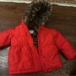 Bright red puffer jacket with a warm faux fur hood. Ideal for cold weather.