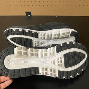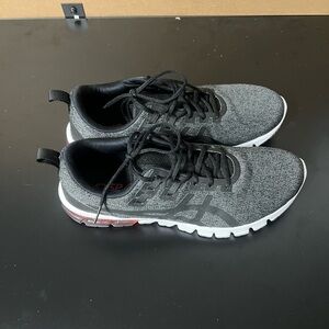 Used less than 10 times. Sleek ASICS sneakers with gray mesh and red accents. Ideal for comfort and style.