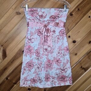 Sequin Hearts 00s Strapless Mini Dress Satin Tie Floral White Pink Glam Sz 5(XS)