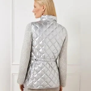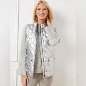 Elevate your style with this chic Talbots silver quilted down vest. Perfect for layering, it adds a touch of elegance to any outfit.