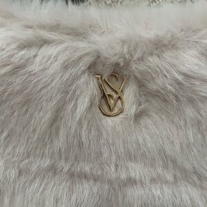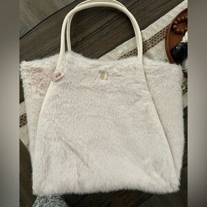 Stylish faux fur tote bag in a soft cream color. Perfect for any occasion.