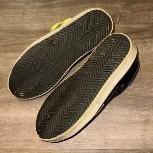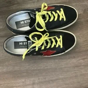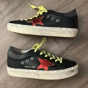 Stylish Golden Goose sneakers. Black leather with red star detail. Yellow laces. Signature branding on sole.