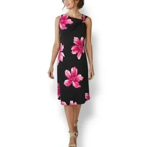 Turn heads in this stunning S.L. Fashions Petite sheath dress featuring bold magenta-pink floral prints on a sleek black background. The asymmetrical knot-shoulder drape detail adds a sophisticated touch, creating a flattering silhouette that works beautifully for cocktail parties, weddings, dinners, and spring/summer events.