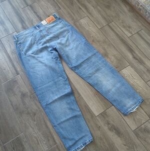 Up for sale is a pair of Levi's 550 '92 Men's Relaxed Taper Fit Distressed Blue Denim Jeans in size 34x34. These jeans feature a 5-pocket design with a zip closure, made of 100% cotton material with a medium fabric wash. The distressed and logo accents give it a grunge and 90s theme. These jeans are perfect for any season - winter, summer, fall, or spring. They are machine washable and made in Bangladesh. Don't miss out on adding these classic Levi's to your wardrobe!