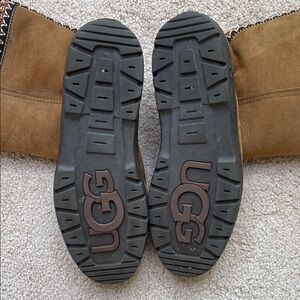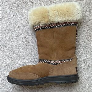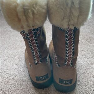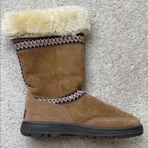 Warm tan suede boots with plush cream lining. Perfect for winter wear. Durable and stylish.