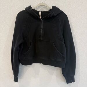 Cozy charcoal hoodie with front pocket. Features a half-zip design. Perfect for casual wear.