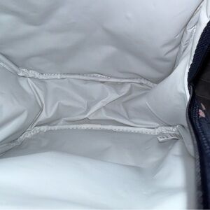 Stylish quilted women's small lunch bag featuring a vibrant flamingo print on a Navy background. Perfect for adding a touch of fun to your lunch.